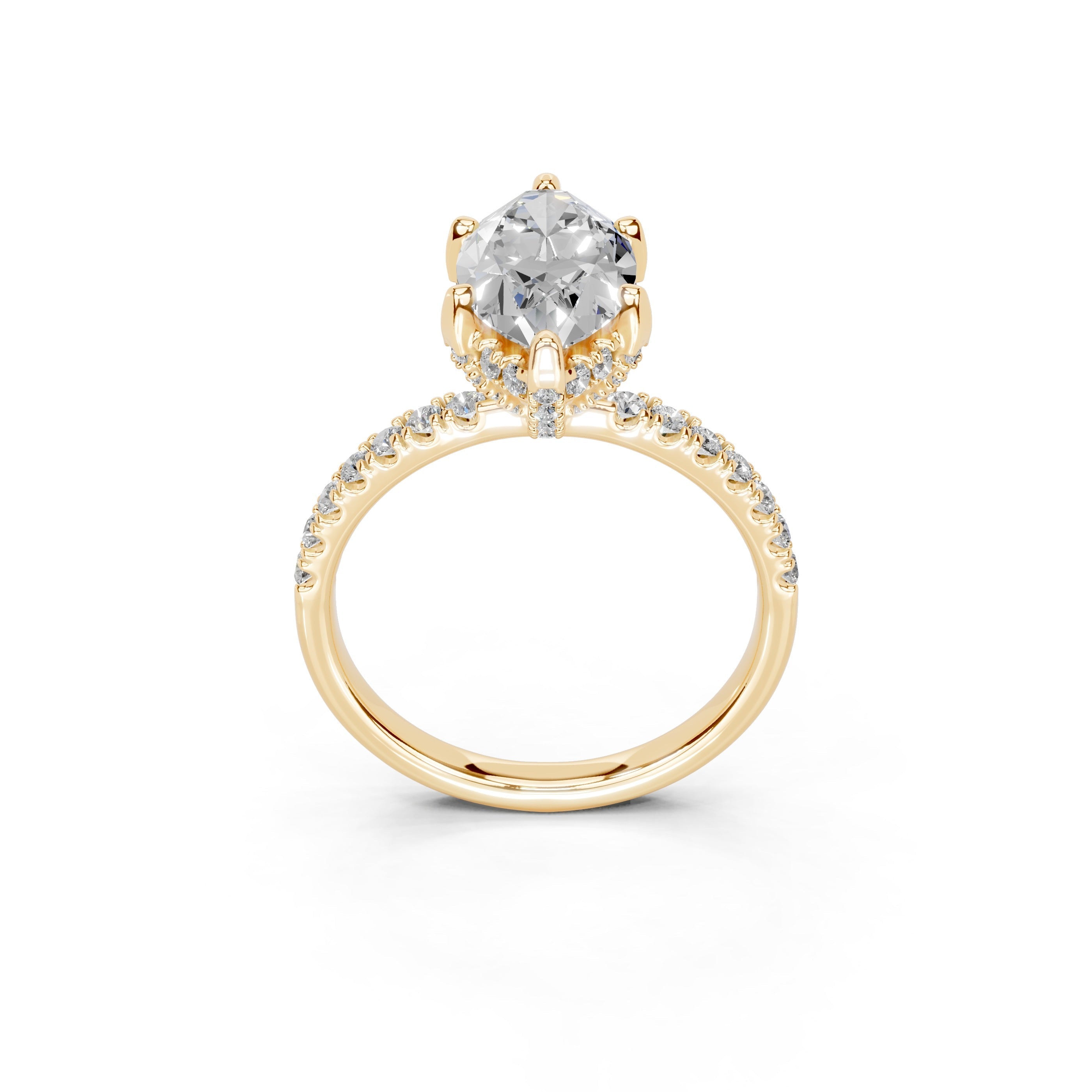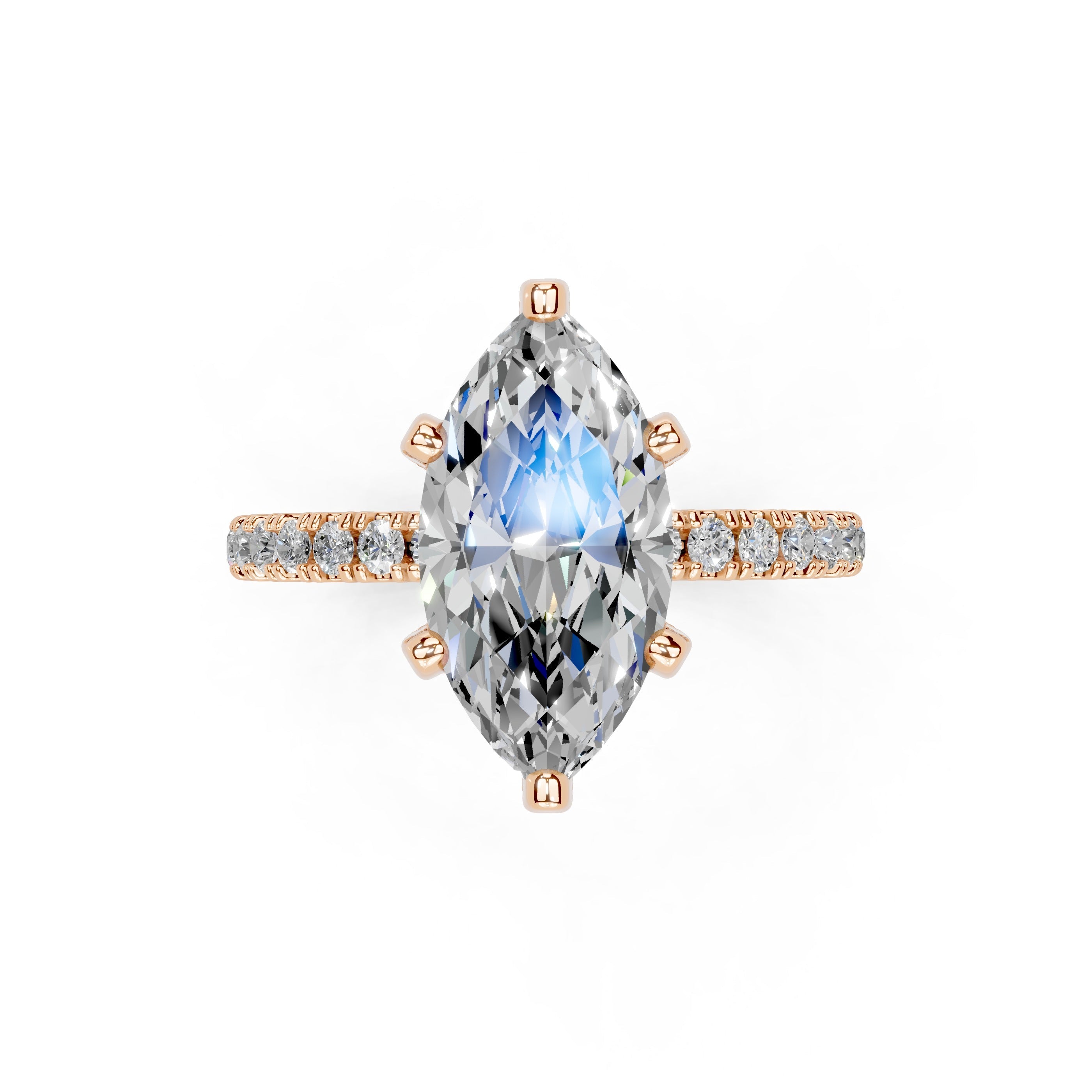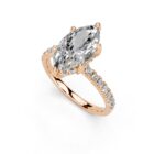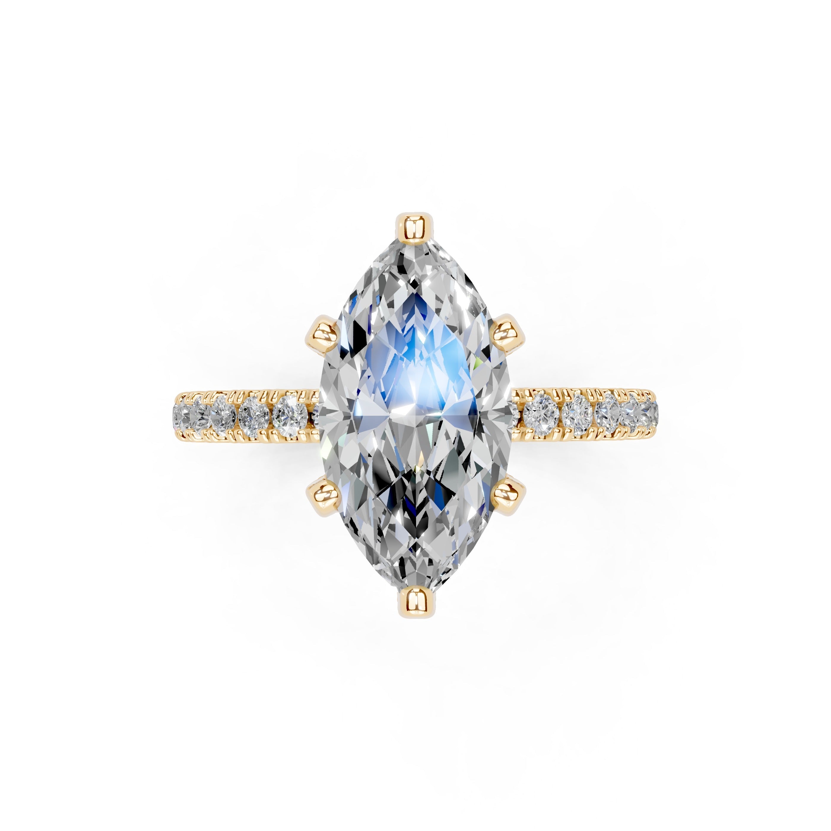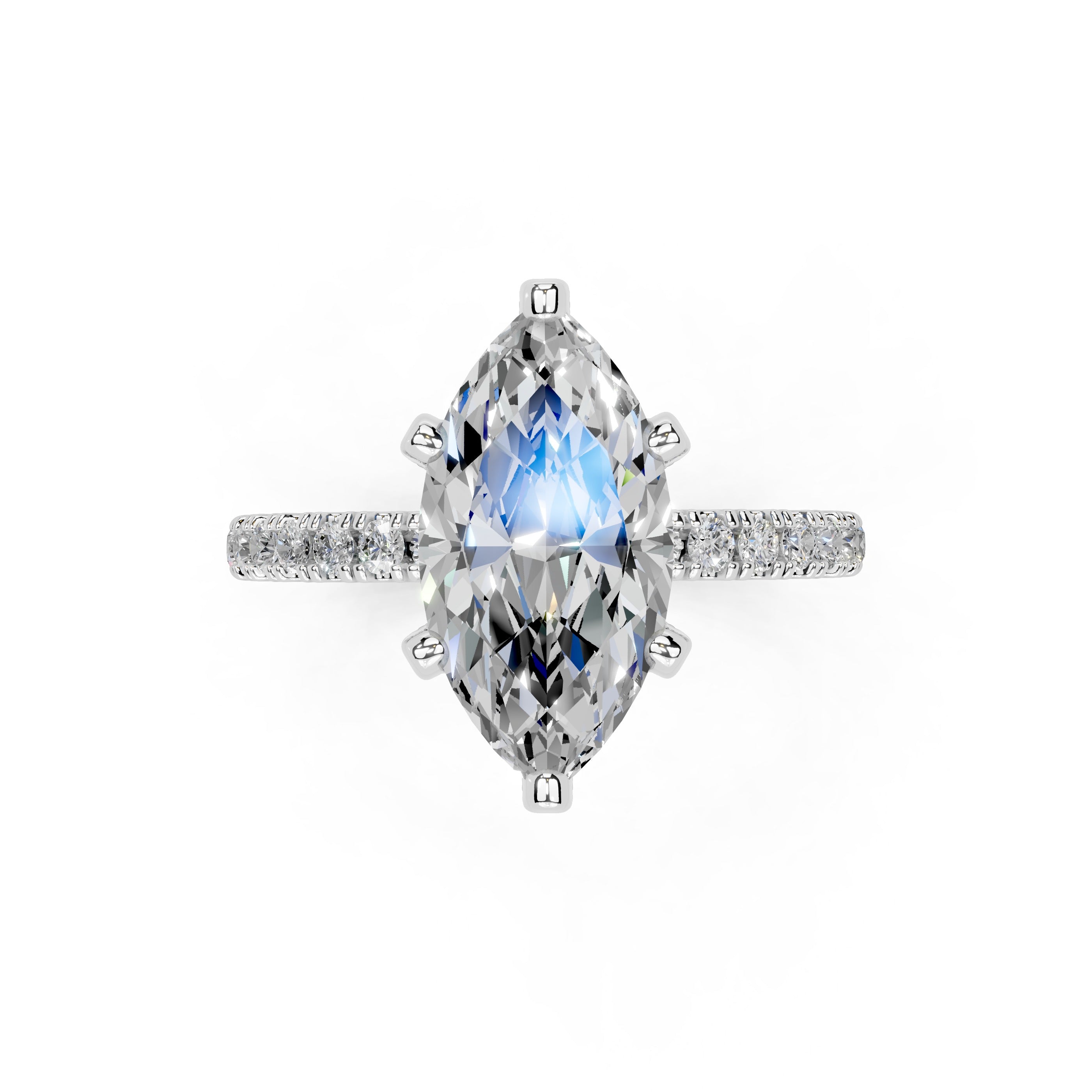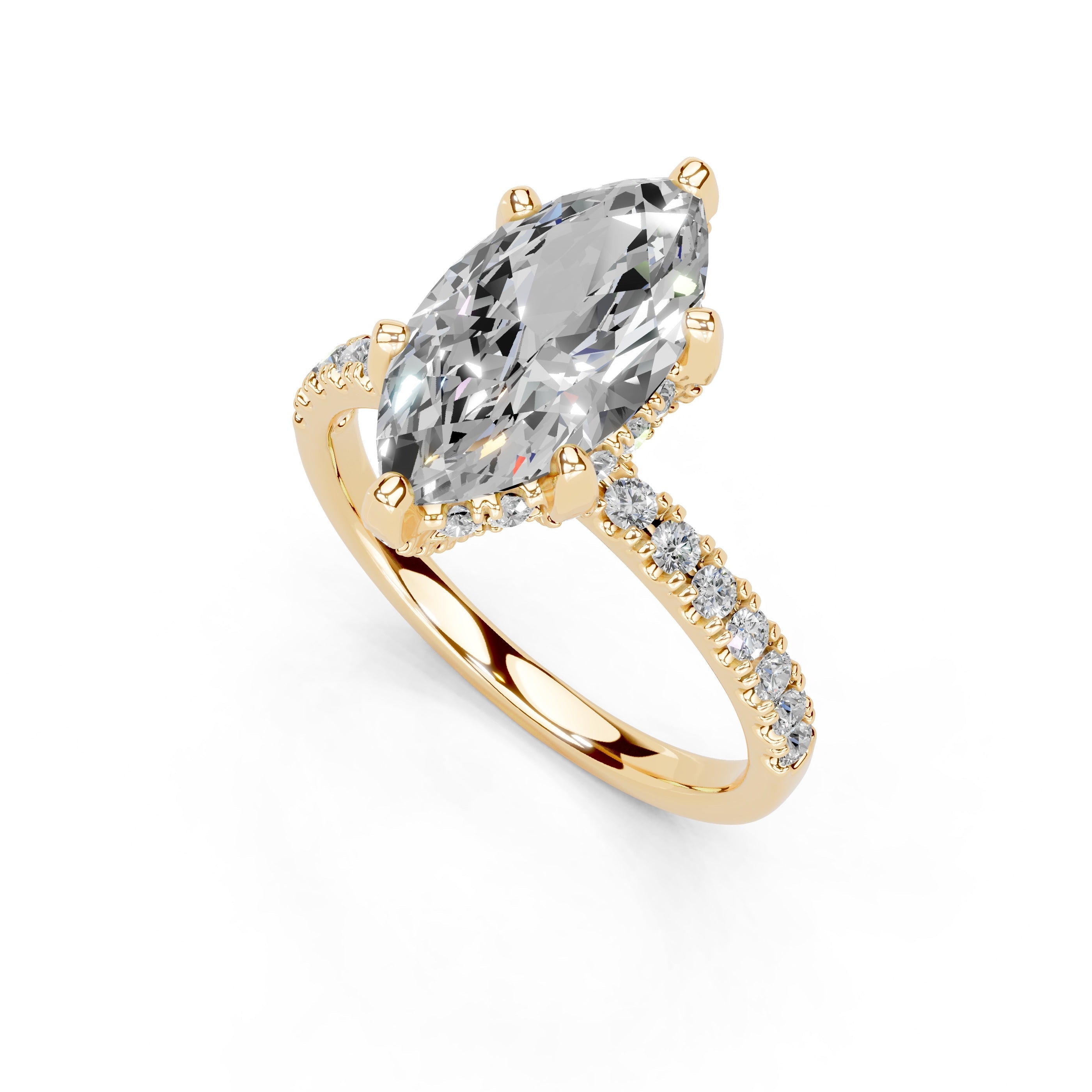 Engagement Ring Style: The Marquise Cut Hidden Halo Pavé Lab Grown Diamond Engagement Ring features a breathtaking marquise-cut diamond at its center, gracefully held by claw prongs that accentuate its elongated, elegant shape. A hidden halo of diamonds surrounds the base of the center stone, adding a delicate yet stunning layer of brilliance. The band is lined with pavé-set diamonds, creating a captivating blend of timeless sophistication and modern allure.